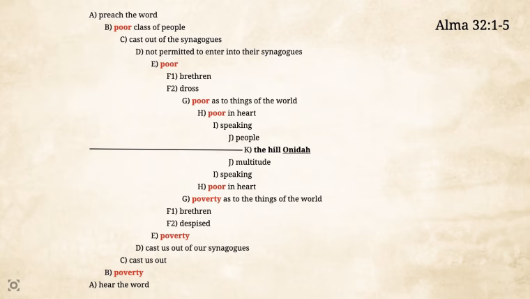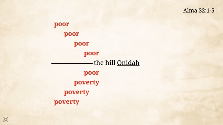 Around it, the word “poor” and “poverty” are mirrored repeatedly, reminding us of who Alma’s audience really is: the despised, the outcast, the ones excluded from worship.