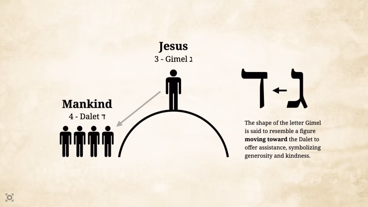 In this tradition, gimel (3) is linked to gemilut chasadim (“acts of loving-kindness”), while dalet (4) is linked to dal (“the poor”).
